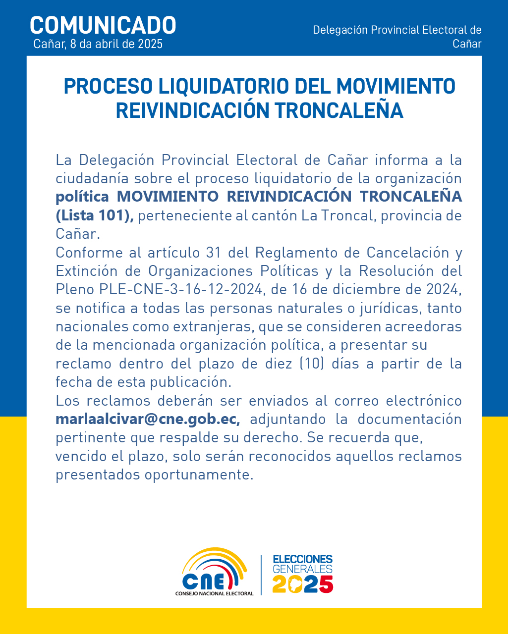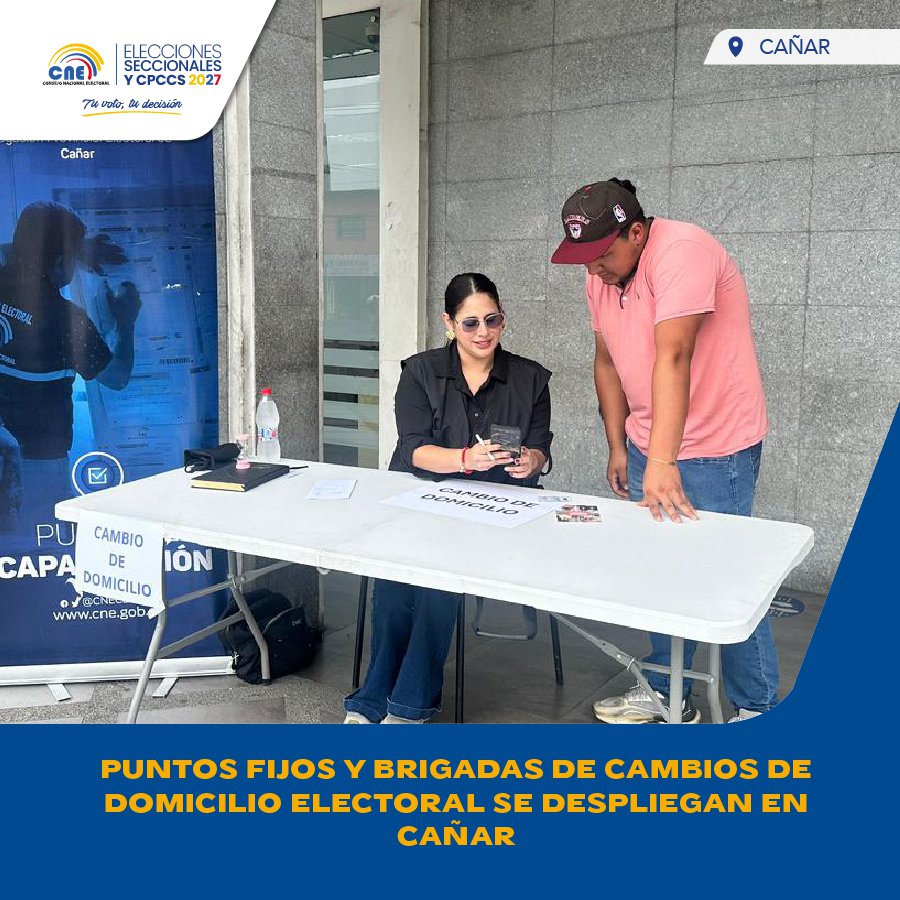La Delegación Provincial Electoral de Cañar informa que, del 8 al 17 de abril, se desarrollarán brigadas y puntos fijos de Cambios de Domicilio Electoral