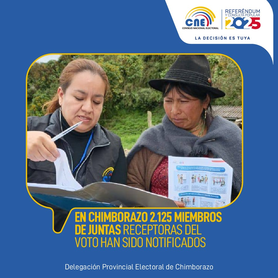 La Delegación Provincial Electoral de Chimborazo continúa con el proceso de notificación a los ciudadanos seleccionados como Miembros de las Juntas Receptoras del Voto (MJRV), quienes participarán en el Referéndum y Consulta Popular 2025. Esta actividad inició el 9 de octubre y se ejecuta en todo el territorio provincial.