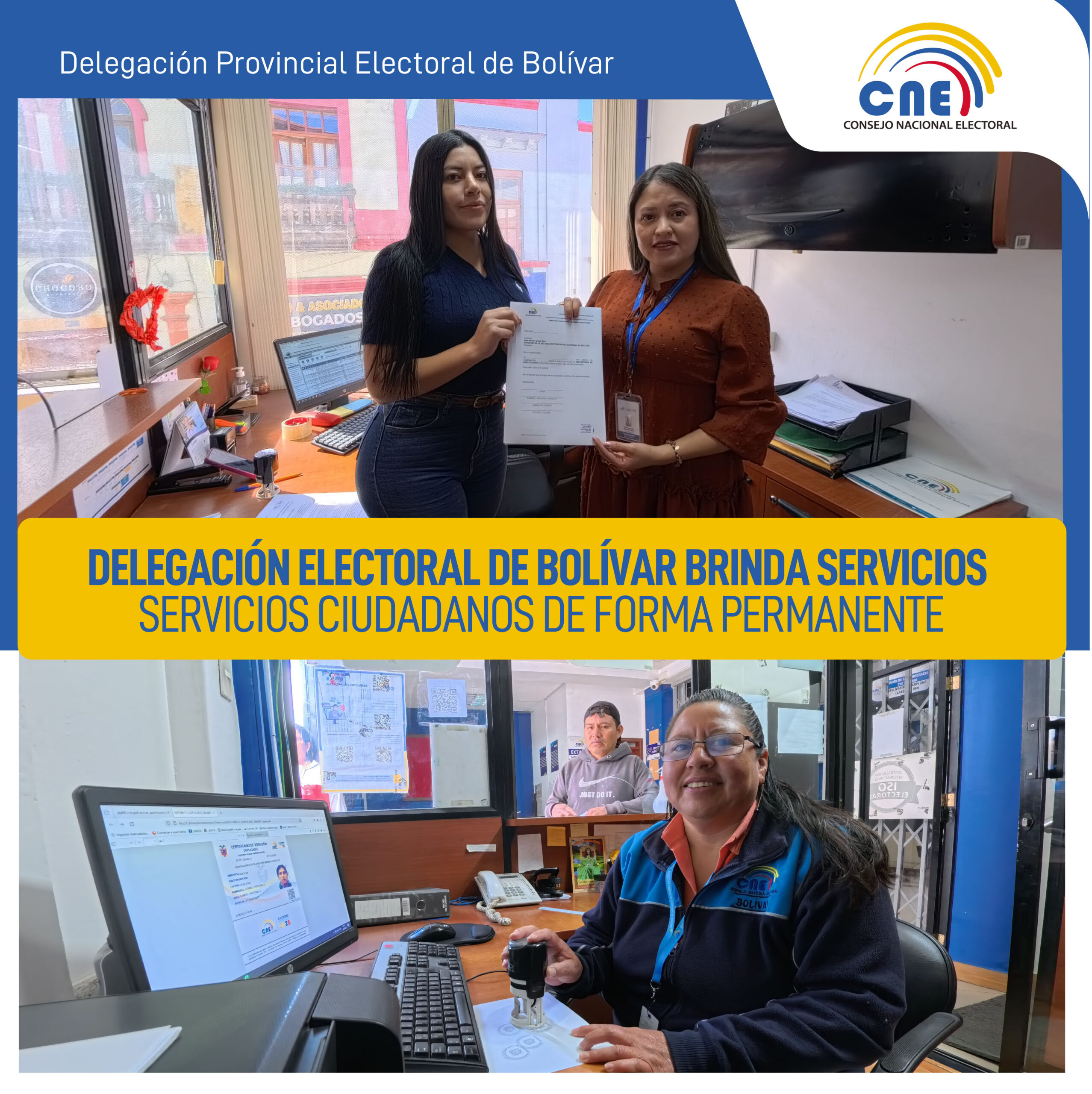 La Delegación Provincial Electoral de Bolívar informa a la ciudadanía que se mantienen habilitados los servicios de atención al público, entre los cuales constan la emisión de certificados de votación provisional, certificados de apoliticismo y certificados de goce de derechos políticos; así como los trámites de desafiliación y las justificaciones