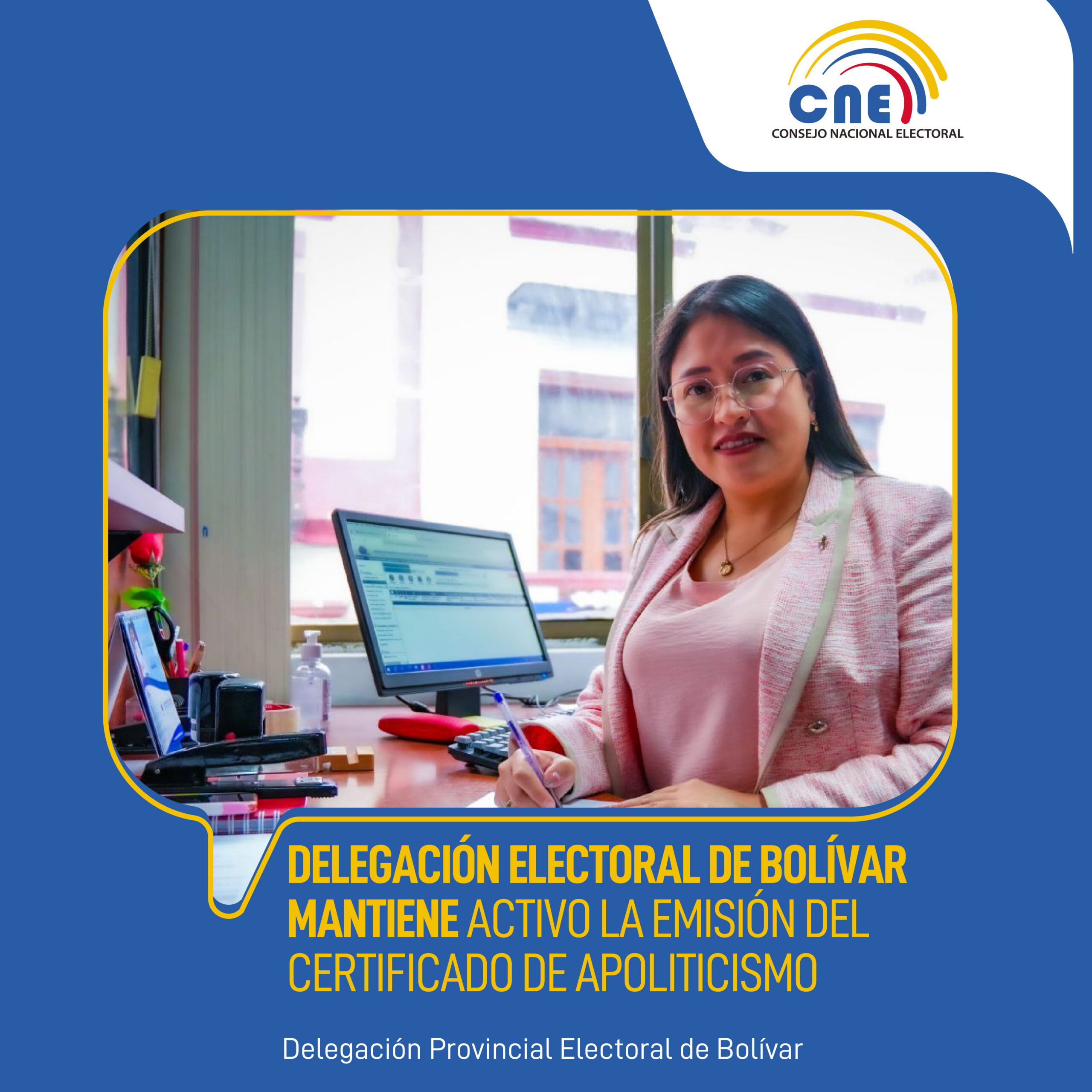 La Delegación Provincial Electoral de Bolívar informa a la ciudadanía que se mantiene activo el servicio de emisión del Certificado de Apoliticismo, documento oficial que acredita si un ciudadano pertenece o no a una organización política. Este trámite puede realizarse de manera presencial, de lunes a viernes, en nuestras oficinas