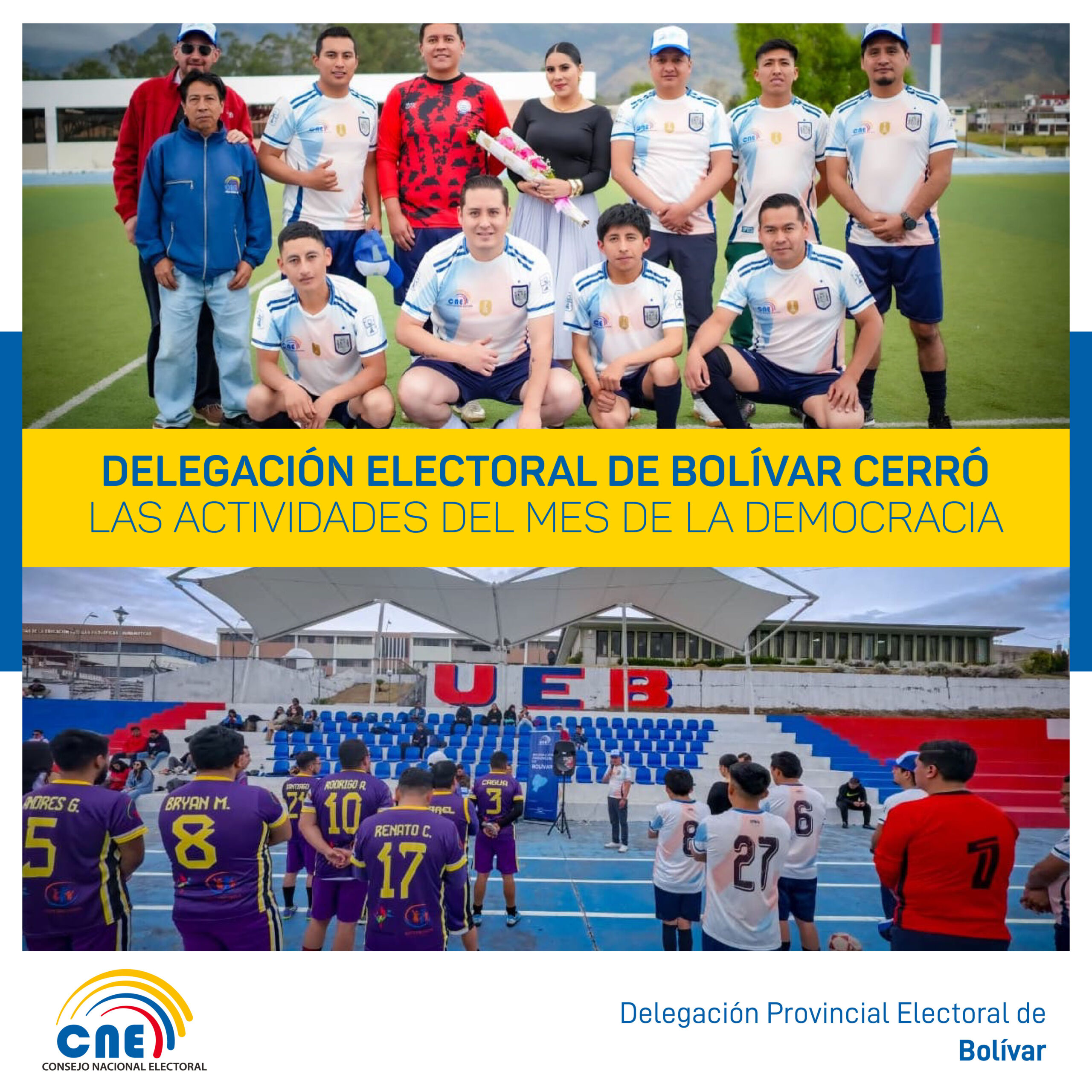 La Delegación Provincial Electoral de Bolívar, cerró las actividades del Mes de la Democracia con un emocionante Cuadrangular de Fútbol “Un Gol por la Democracia”, que contó con la participación de equipos de diversas instituciones públicas del cantón Guaranda. Como parte de la programación, también se llevó a cabo la