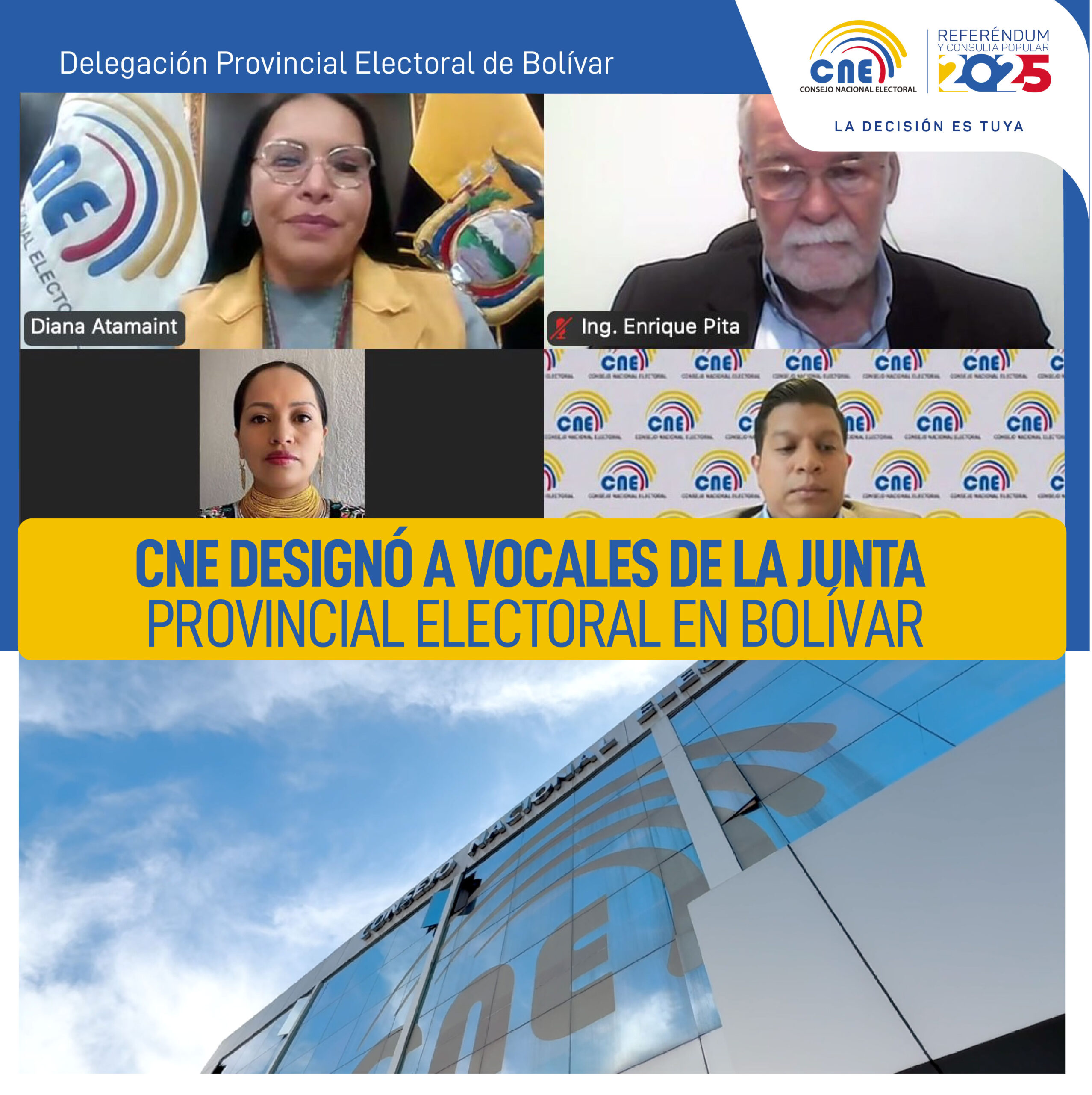 En el marco del Referéndum y Consulta Popular 2025, la noche del viernes, 3 de octubre, el Pleno del Consejo Nacional Electoral (CNE) designó a los vocales de la Junta Provincial Electoral de Bolívar. Las personas designadas para integrar la Junta Provincial son: Gonzalo Andrés Vargas Secaira Xavier Enrique Montalvo