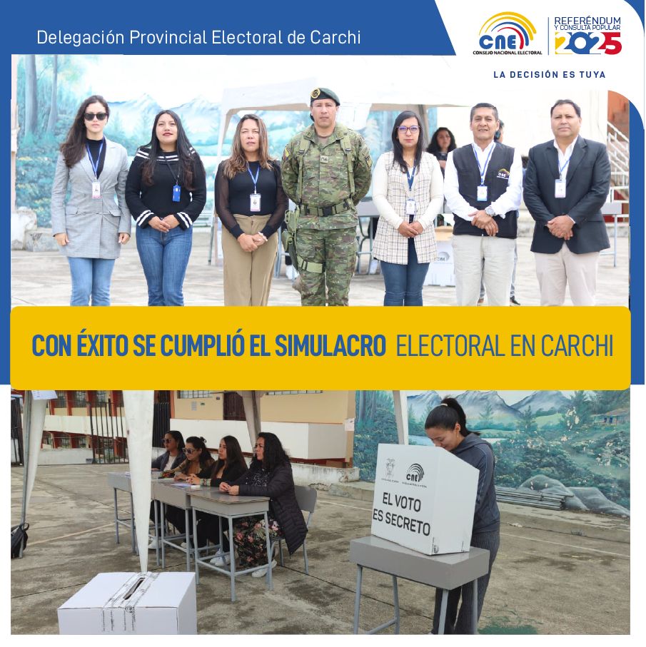 En cumplimiento al Calendario Electoral, este domingo 09 de noviembre se llevó a cabo el Simulacro Electoral en Carchi, en el recinto emblemático de la Unidad Educativa Tulcán.El objetivo de este ejercicio fue poner a prueba todo el contingente técnico, logístico y operativo para la cita democrática del próximo domingo