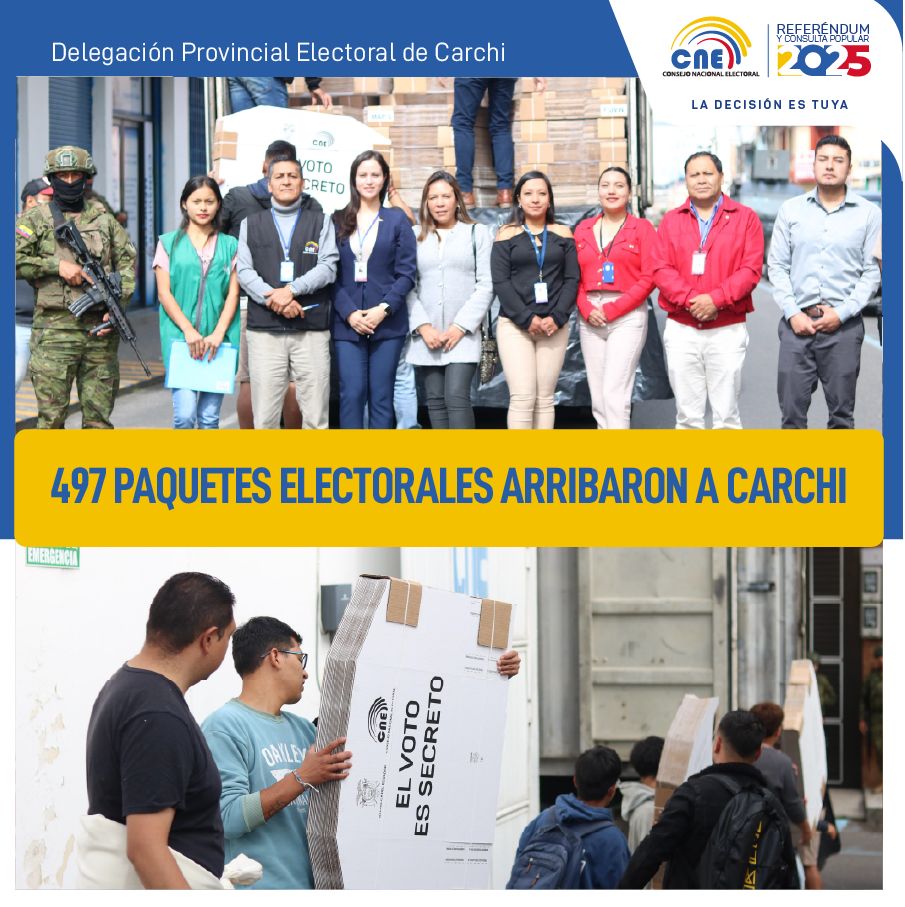 Este lunes 10 de noviembre arribaron los paquetes electorales a la Delegación Provincial Electoral de Carchi, para el Referéndum y Consulta Popular 2025. Son en total 497 paquetes electorales, que ingresan a las bodegas de la institución, con las respectivas urnas y biombos, cuyo traslado contó con el resguardo de