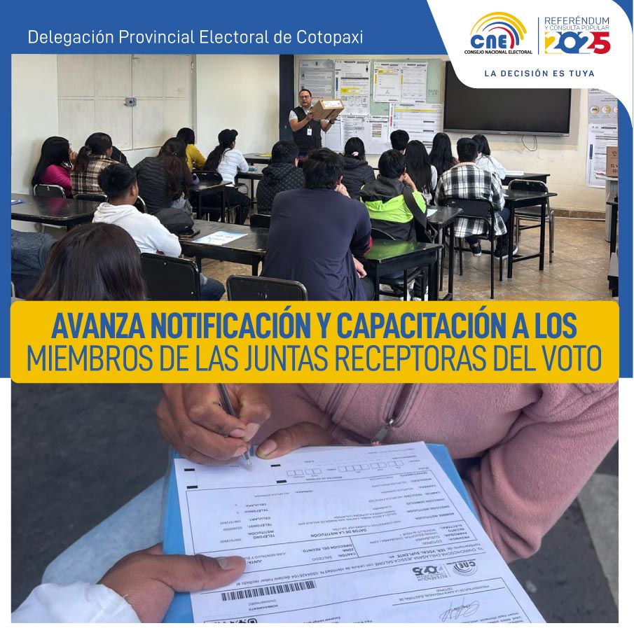 La Delegación Provincial del Consejo Nacional Electoral (CNE) ejecuta la capacitación a los 8.414 ciudadanos que integrarán las Juntas Receptoras del Voto (JRV) en Cotopaxi y participarán en el Referéndum y Consulta Popular convocado para el domingo 16 de noviembre de 2025. Las notificaciones se han ejecutado en un 63,46%