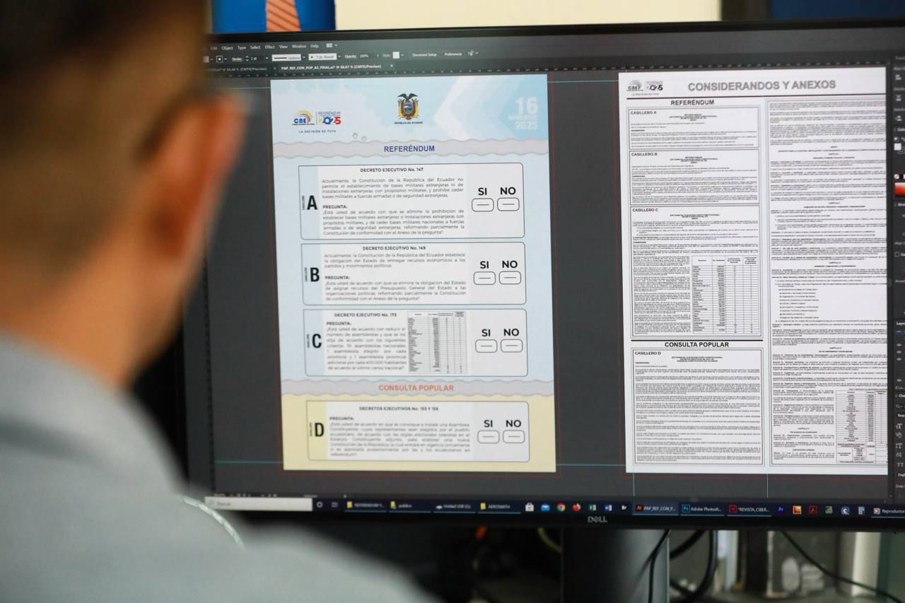 El Consejo Nacional Electoral (CNE) junto al Instituto Geográfico Militar (IGM), continúa la impresión de 13´938.724 papeletas electorales del Referéndum y Consulta Popular 2025. Mediante cadena nacional de radio y televisión, entre otros aspectos importantes el CNE informó que al 26 de octubre, la impresión de papeletas está al 42,62%;