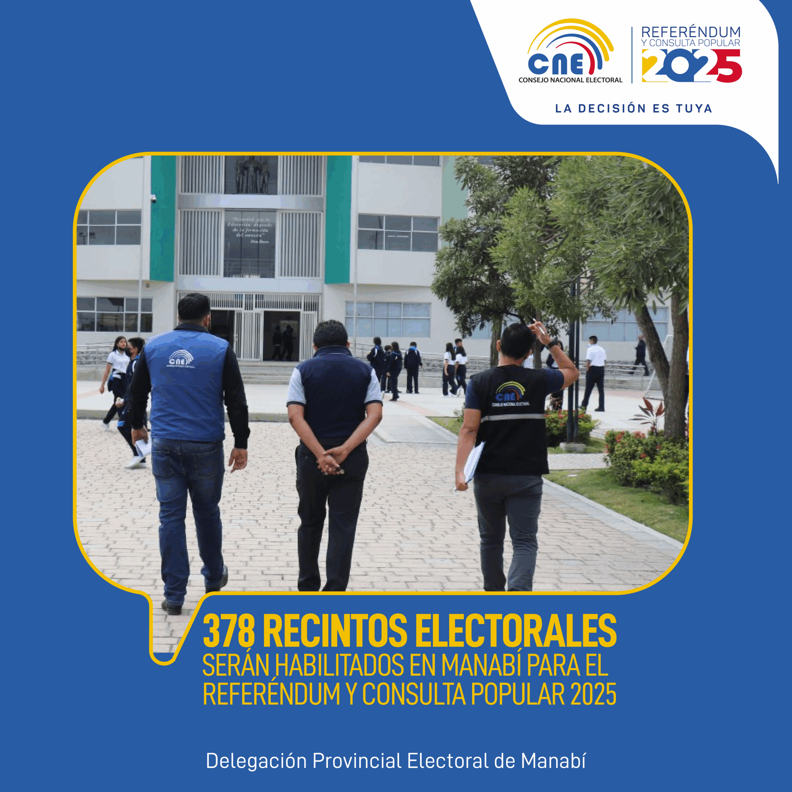 La Delegación Provincial Electoral de Manabí, a través de la Dirección de Procesos Electorales, realizó entre el 22 de septiembre y el 6 de octubre de 2025 el levantamiento del catastro de recintos que serán habilitados para el Referéndum y Consulta Popular 2025. Tras este proceso técnico, la Junta Provincial