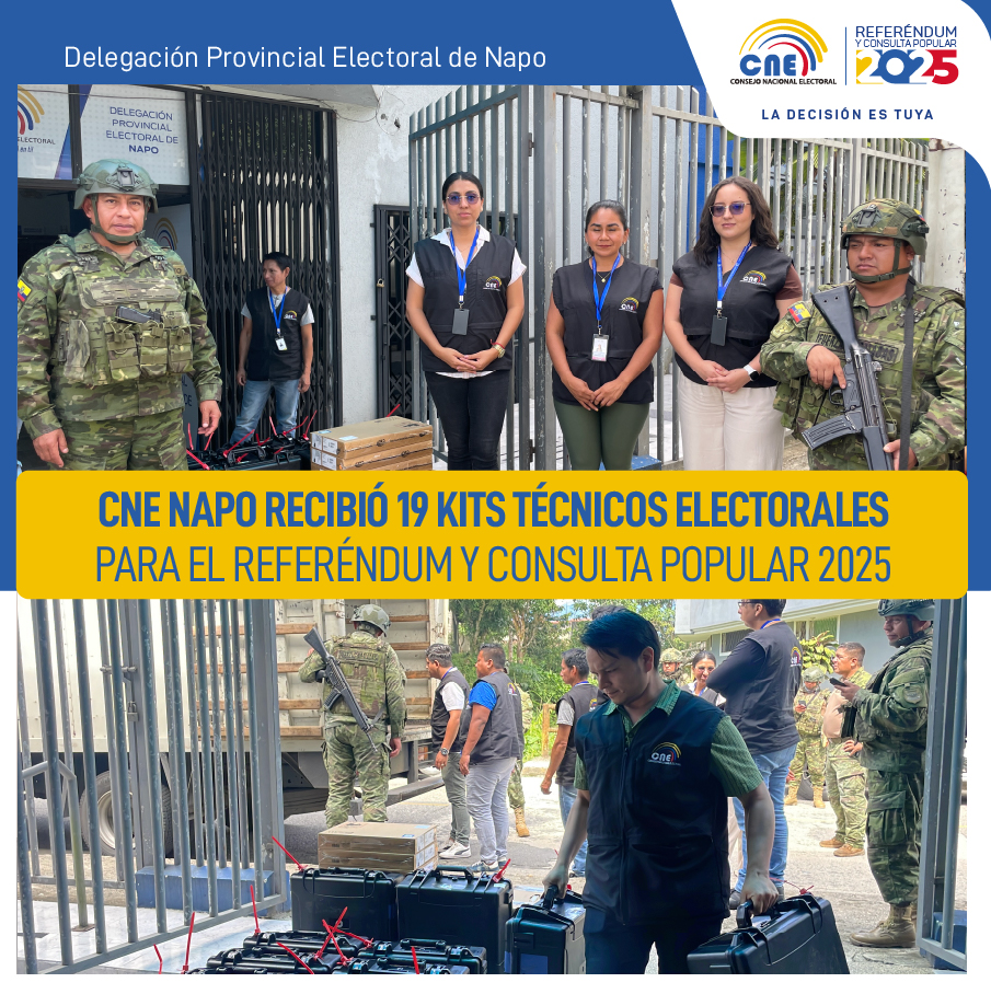 Este 25 de octubre de 2025, la Delegación Provincial Electoral de Napo recibió 19 kits técnicos electorales, compuestos por un computador portátil, un escáner, cables de poder y cables USB, los cuales serán utilizados en la prueba técnica, simulacro y en el proceso democrático de Referéndum y Consulta Popular 2025. Estos equipos