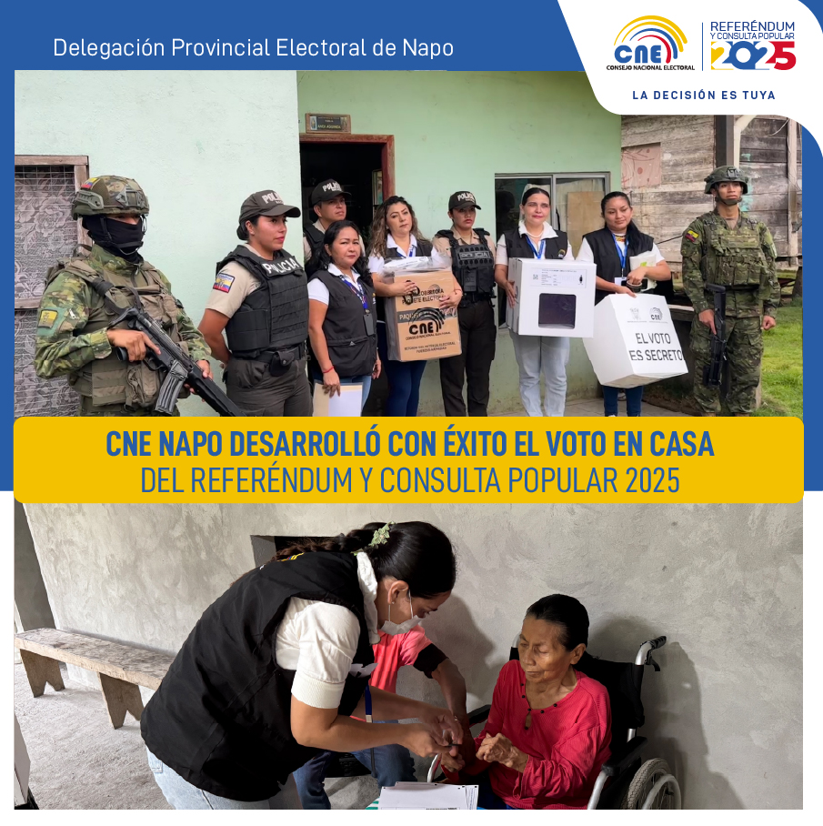 Este viernes 14 de noviembre, la Delegación y la Junta Provincial Electoral de Napo ejecutaron con éxito el programa Voto en Casa, correspondiente al Referéndum y Consulta Popular 2025. Esta iniciativa garantiza el derecho al sufragio de las personas mayores de 50 años con discapacidad física igual o superior al 75