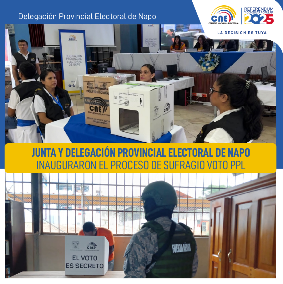 Esta mañana, en el marco del Referéndum y Consulta Popular 2025, se desarrolló con éxito el proceso de Voto de las Personas Privadas de la Libertad (PPL) sin sentencia condenatoria ejecutoriada en la provincia de Napo. El acto inaugural tuvo lugar en el Salón de la Democracia de la Delegación