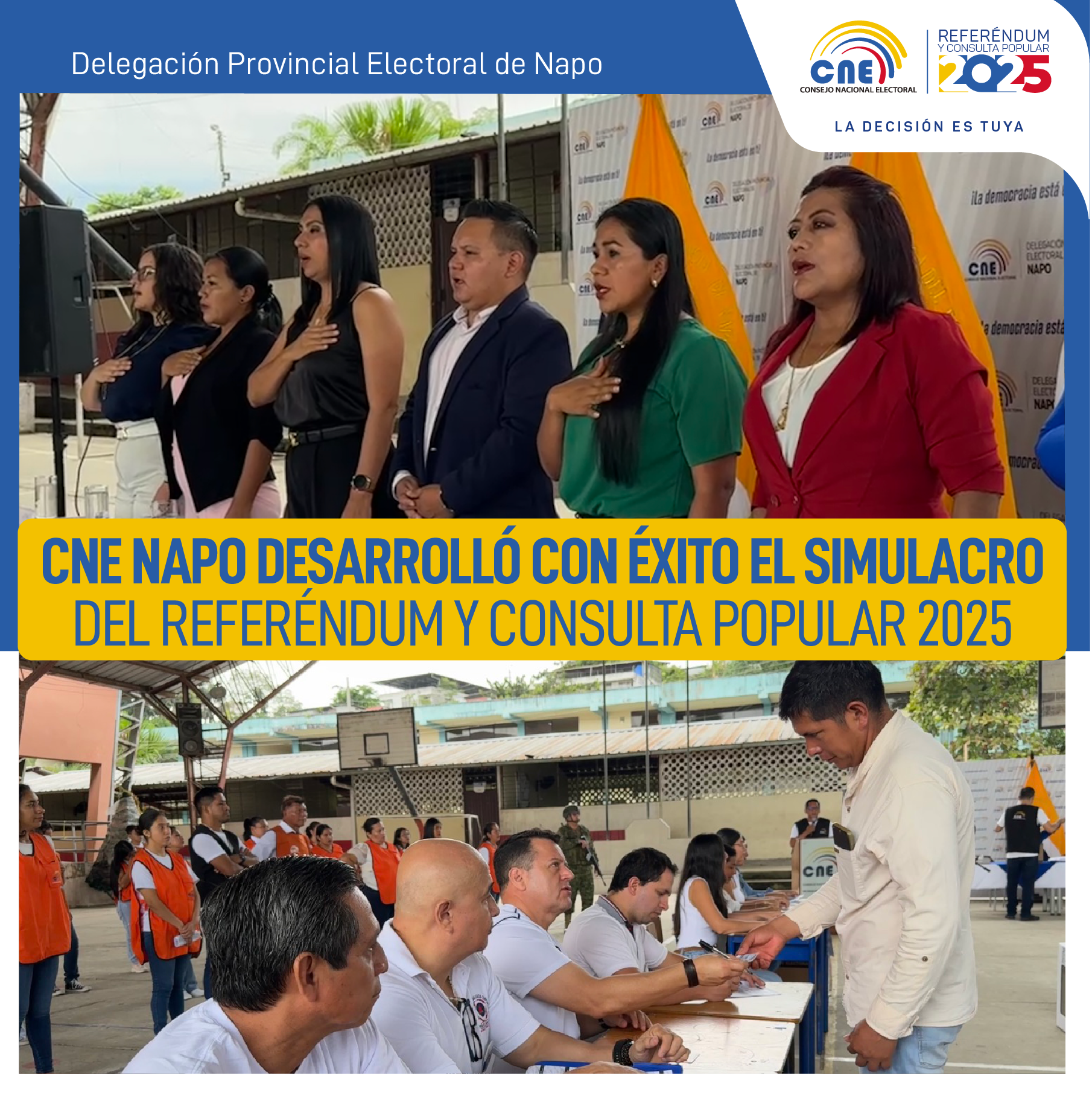 Este domingo 09 de noviembre de 2025 se llevó a cabo el Simulacro Nacional del Referéndum y Consulta Popular 2025, a fin de evaluar la operatividad y eficiencia del proceso electoral. En Napo, la Delegación y la Junta Provincial Electoral realizaron esta actividad en el recinto emblemático Unidad Educativa Nacional Tena, con