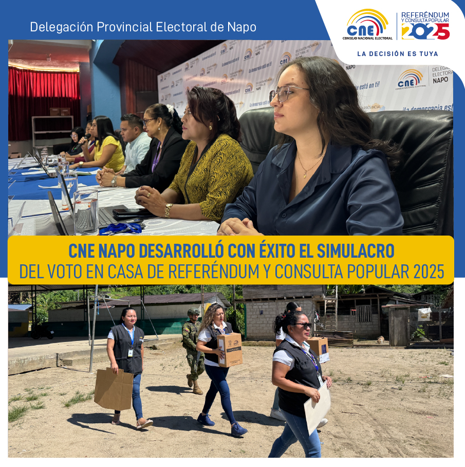 En el marco del Referéndum y Consulta Popular 2025, esta mañana, la Delegación y la Junta Provincial Electoral de Napo desarrollaron el Simulacro del Voto en Casa, mismo que garantiza la participación de las personas mayores de 50 años, con una discapacidad física igual o superior al 75% debidamente certificada; y
