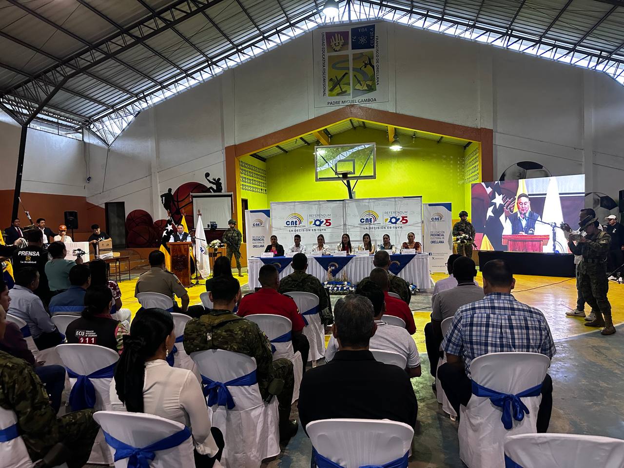Este domingo 16 de noviembre de 2025, en la Unidad Educativa Fiscomisional “Padre Miguel Gamboa”, se desarrolló el acto inaugural de la jornada electoral correspondiente al Referéndum y Consulta Popular 2025. El evento contó con la presencia de autoridades electorales, representantes de instituciones públicas, medios de comunicación y delegados de