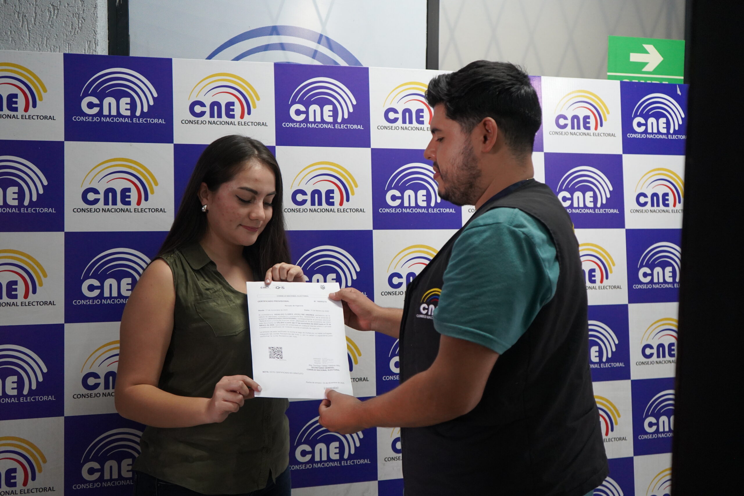 Luego de haberse realizado el proceso electoral de Referéndum y Consulta Popular 2025, el 16 de noviembre, el Consejo Nacional Electoral a través de las delegaciones provinciales electorales se encuentra entregando el certificado provisional a quienes, por alguna circunstancia, no acudieron a votar. El documento tiene una validez de 90 días y se entregará