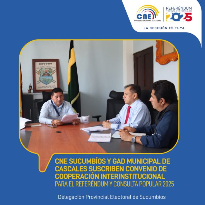 Con el objetivo de coordinar acciones conjuntas para el desarrollo del Referéndum y Consulta Popular 2025, este 6 de octubre, la Delegación Provincial Electoral de Sucumbíos suscribió un convenio de cooperación interinstitucional con el Gobierno Autónomo Descentralizado Municipal del cantón Cascales. A través de este convenio, ambas instituciones unirán esfuerzos