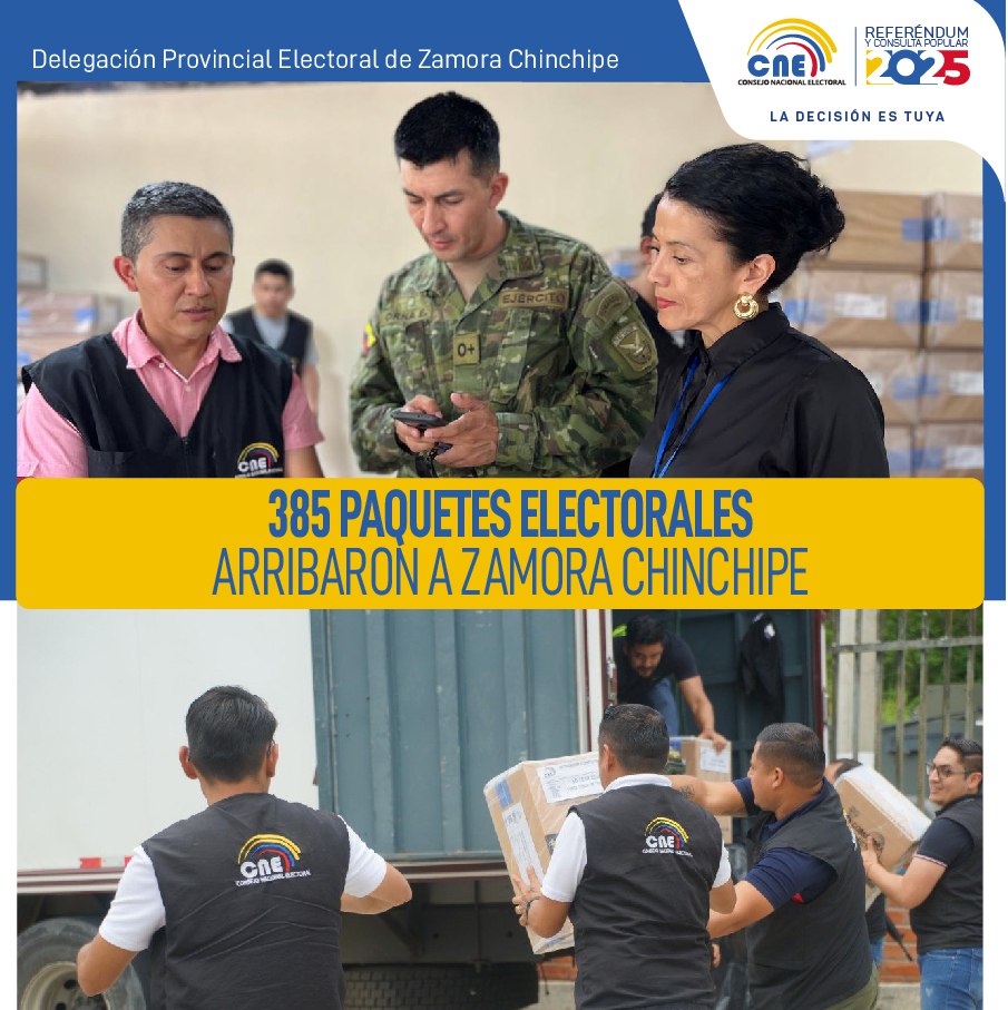 Este jueves 06 de noviembre, bajo custodia de las Fuerzas Armadas, arribaron a la Delegación Provincial Electoral de Zamora Chinchipe, los 385 paquetes electorales para las elecciones de Referéndum y Consulta Popular 2025. Los paquetes electorales serán resguardados en la bodega de esta casa electoral, y posteriormente ser distribuidos en